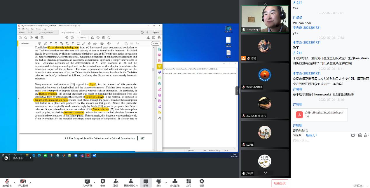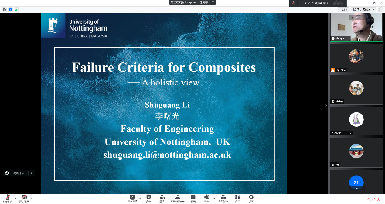 应304am永利集团官网陈杨副教授邀请,英国诺丁汉大学李曙光教授于2022年7月4日至7日开展了题为“FailureCriteria for Composites”的线上学堂,本次课程依托304am永利集团官网国际合作处“暑期国际学堂”平台举办。来自304am永利集团官网、航空学院、力学与土木建筑学院等共20余名学生选课参加了本次课程。同时,来自浙江大学、中国商飞、航空工业飞机强度研究所等校外单位的老师、学生和科技工作者旁听了本次课程。