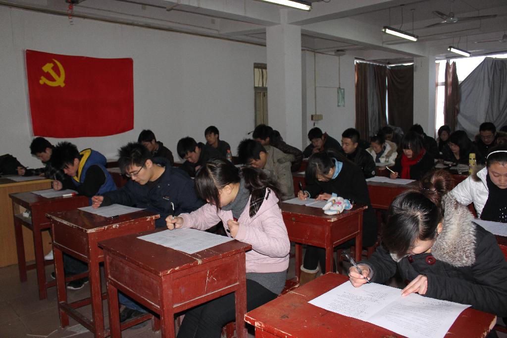 在即将告别2010年之际,2010年12月31日上午9:00,艺术系学生党支部在四号教学楼三楼艺术系多媒体教室组织艺术系在校学生党员、预备党员参加党的基础理论知识的考试。党总支组织相关老师对学生党员试卷进行认真审阅,学生党员成绩全部达到合格水平。