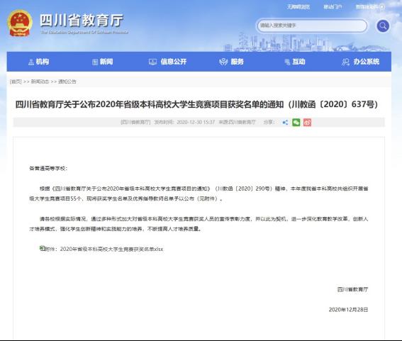 12月31日,2020年四川省大学生原创动漫大赛评审结果在四川省教育厅和四川省本科高校竞赛平台官网上陆续公布,beat365官网学生取得佳绩,获得一等奖1项、二等奖2项、三等奖9项,南京、刘婉毅获得“优秀指导老师”。