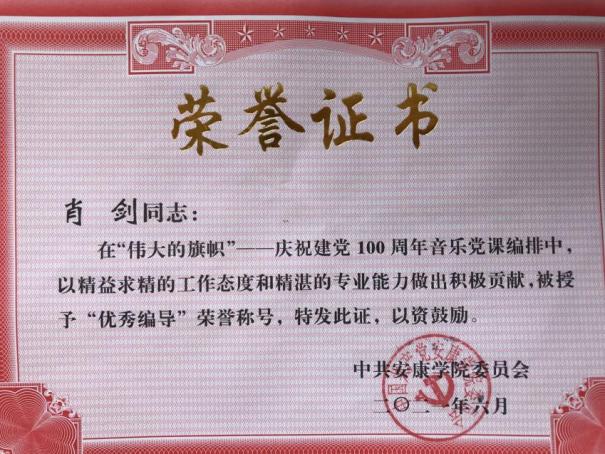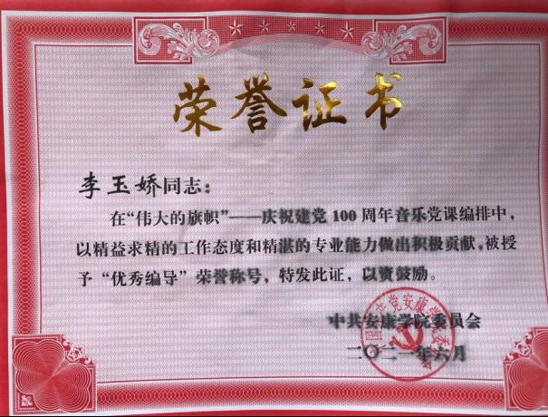 党委副书记、纪委书记、监察专员安永强宣读了学校党委《关于对“辉煌百年·七个一”系列活动进行表彰的决定》及获奖先进集体和个人名单。beat365官网在“伟大旗帜”——庆祝建党一百周年音乐党课中荣获突出贡献奖,肖剑、李玉娇获“优秀编导奖”;学生党支部报送的微视频——《艺心向党》荣获“我和我的支部”故事征文(微视频)大赛一等奖。