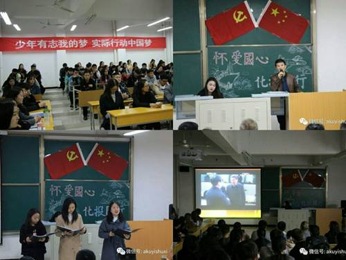 班会上,还邀请退役复学的2014级视觉传达设计1班罗宇乾和2015级音乐学1班郭春平同学介绍他们在部队的生活经历和体会:两年军营生活,让自己改变了很多,收获了很多。昔日里在训练场、演训场上的挥汗如雨,和战友们在一起经历过的风风雨雨,一切依然历历在目,刻骨铭心。有人说当兵后悔两年,不当兵后悔一辈子;我说当兵两年不后悔,不当兵才后悔一辈子。也有人问:当兵那么苦,那么累,你为什么还要去?值得吗?我说:值得!当兵确实很苦很累,每天摸爬滚打,斗严寒,战酷暑,抗风沙,一身泥一身汗,可是它磨炼了我们钢铁般的意志品质!南开大学八名学子歇笔从戎,参军入伍给当代大学生作了一个很好的榜样。他们把自己的个人梦,融入到了中国梦当中,将自己的爱国之心,化为投身强军之行。现在复原回到熟悉的校园,使我们更加珍惜来之不易的学习环境,我们要严格要求自己,遵守校纪校规,为其他同学做出遵守纪律的楷模;努力学习专业技能,提高自身素质,毅然决然地承担起中华民族伟大复兴的历史重任,不辱使命,上得去,顶得住。用自己的青春书写无愧时代,无愧于历史的华丽篇章!