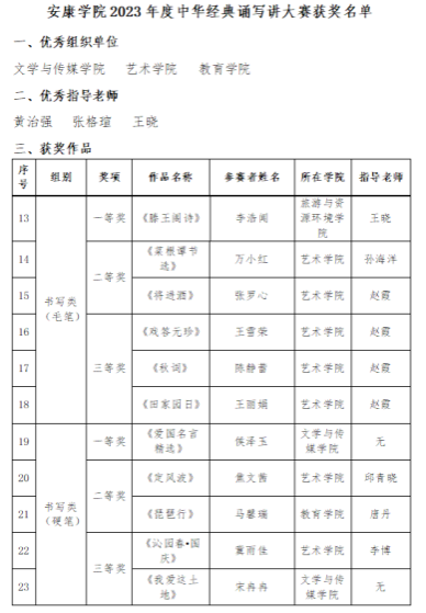 艺术学院在学校2023年度中华经典诵写讲大赛中成绩突出,书写类(毛笔)二等奖两项,三等奖三项。书写类(硬笔)二等奖一项,三等奖一项。beat365正版唯一官网必一被评为优秀组织单位。在此向获奖学生予以祝贺。