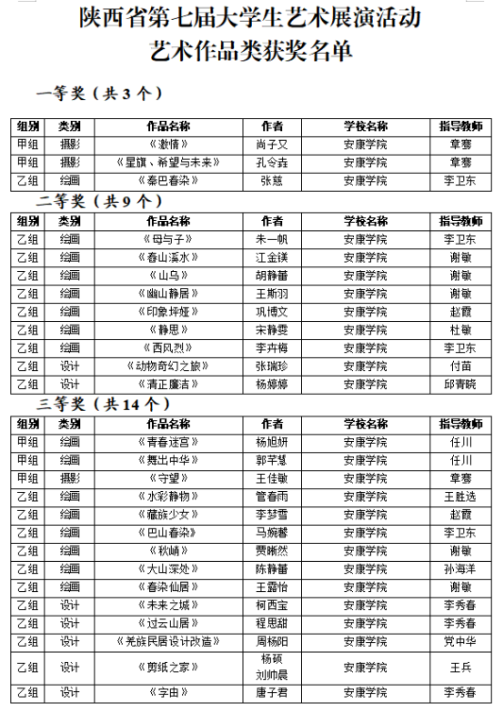 12月8日,省教育厅公布了陕西省第七届大学生艺术展演活动评选结果,beat365官网参赛师生共获得各类奖项34项。其中《元创设计艺术工作坊》获一等奖,并被推荐到教育部参加全国第七届大学生艺术展演;艺术作品类获一等奖3项、二等奖9项、三等奖14项;艺术表演类获二等奖1项、三等奖6项。