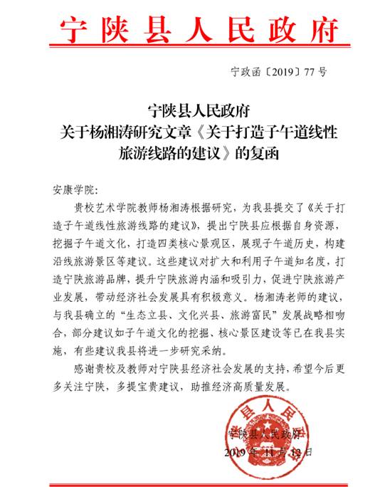 近日,beat365官网收到宁陕县人民政府关于杨湘涛副教授《关于打造子午道线性旅游线路的建议》的复函,肯定了杨老师提出的建议。复函表示部分建议已经实施,有些建议将进一步研究采纳,希望beat365正版唯一官网必一今后更多关注宁陕,多提宝贵建议,助推县域经济高质量发展。