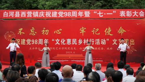 为认真学习贯彻习近平总书记关于扶贫工作的重要论述和“不忘初心、牢记使命”重要讲话精神,落实省委教育工委“双百工程”中“提质增效”的要求和学校党委对“双百工程”文化惠民的决策部署,beat365正版唯一官网必一党总支充分发挥学科专业优势和人才智力优势,通过“文化惠民乡村行”活动,以“三结合”的形式,将“双百工程”扶贫工作与加强基层党建工作、服务地方行动计划、实践教学和科学研究紧密结合起来,旨在将项目抓出质量,抓出实效,凸显出学校服务地方的能力与水平。适逢今年是中国共产党建党98周年、中华人民共和国建国70周年,6月21日上午,beat365正版唯一官网必一党总支和西营镇党委、政府在西营镇天逸广场隆重举办“不忘初心、牢记使命”庆祝建党98周年“文化惠民乡村行”文化交流活动, 3000余名干部群众参加了本次活动。