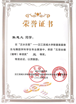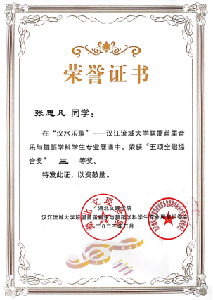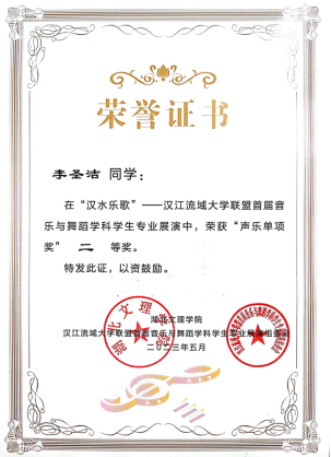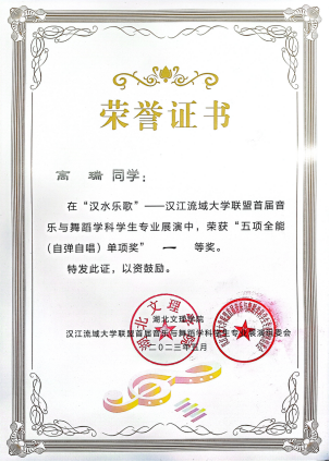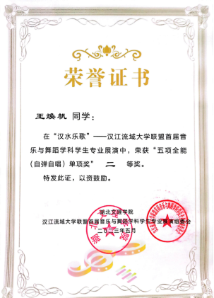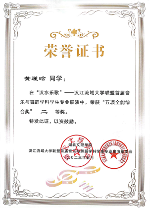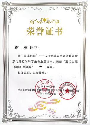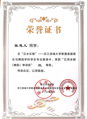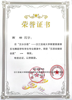 5月23日-26日,“汉水乐歌——汉江流域大学联盟首届音乐与舞蹈学科学生专业展演”活动在湖北文理学院举行。beat365官网音乐学专业学生在此次展演中取得佳绩,共获得五项全能综合奖一等奖1项、二等奖1项、三等奖2项,自弹自唱一等奖1项、二等奖1项,钢琴单项二等奖1项、三等奖2项,器乐单项二等奖1项,舞蹈单项三等奖1,声乐单项二等奖2项,三等奖1项等14项奖项,充分展现了beat365官网音乐学专业学生专业技能和办学质量。