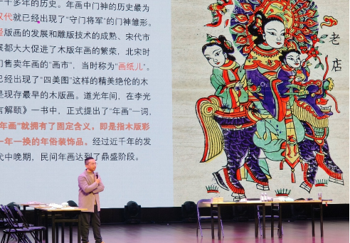 在讲授过程中,毛德龙老师简述了中国非遗版画的发展史、第二批国家非物质文化遗产——木版年画的地方民间艺术图式及版画的应用等方面的艺术知识。