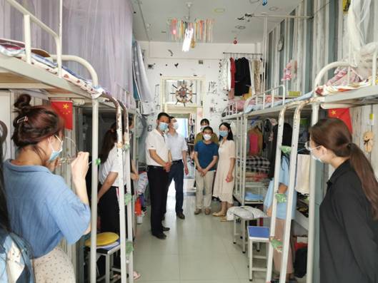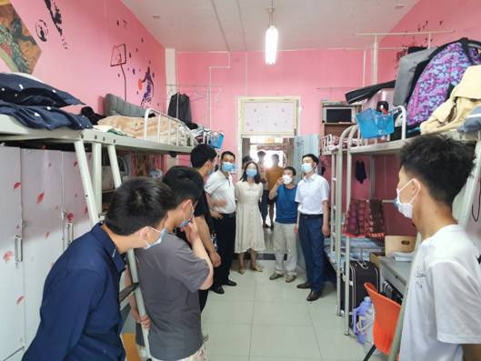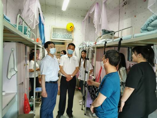 为认真落实学校《关于做好开学期间校园安全检查的通知》要求,确保已返校的毕业生在校园里能有一个安全稳定的学习生活场所。5月3日下午3点,beat365正版唯一官网必一党总支书记樊仁杰、院长杨哲、专职组织员刘泽桢带领辅导员艾蕾、薛涛到学生宿舍看望返校毕业生。