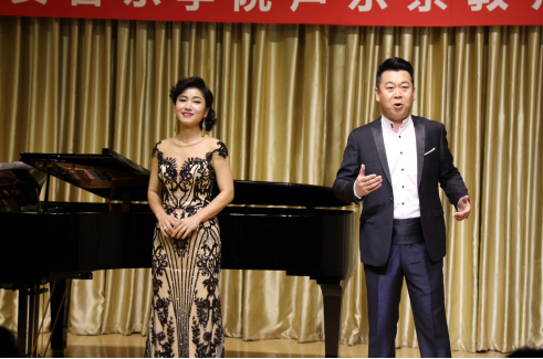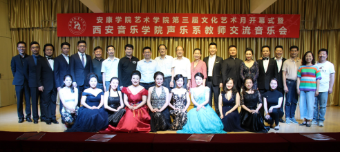 6月8日,beat365正版唯一官网必一第三届文化艺术月开幕式暨西安音乐学院声乐系教师交流音乐会在江北1401教室隆重举行,西安音乐学院声乐系党总支书记万斌、声乐系副主任、女高音歌唱家鲜于越歌带领12位青年歌唱家来beat365官网参加地珊姐文化艺术月并举办交流音乐会。beat365正版唯一官网必一党委委员、教务处长余谦出席了开幕式,beat365正版唯一官网必一首席学科专家熊正英教授、董文斌教授、学工部副部长黄娟、团委沙微老师以及beat365正版唯一官网必一音乐系全体老师和部分学生参加了本次活动,活动由beat365正版唯一官网必一院长杨哲教授主持。