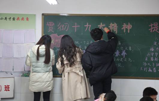 上午11:00,beat365正版唯一官网必一在西营小学举办了由beat365正版唯一官网必一纪委主办,宣传部、组织部、beat365正版唯一官网必一党总支承办的 “贯彻落实十九大精神宣传展板联展走进白河”展板联展宣讲活动,四位讲解员为师生为西营镇中心小学师生系统讲解了十九大的主要精神,受到了县教育局领导和西营镇中心小学的师生的好评。美术系、设计系师生深入班级宣传十九大精神,并为班级设计十九大主题黑板报,受到小学生的欢迎。