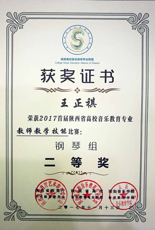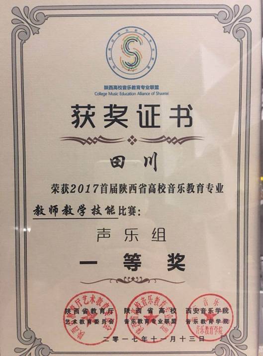 11月13日,beat365官网田川、王正祺老师在陕西省教育厅艺术教育委员会主办、西安音乐学院音乐教育学院承办的“2017首届陕西省高校音乐学专业教师教学技能比赛”中分获声乐组一等奖和钢琴组二等奖,体现了beat365官网音乐专业教师在全省高校中良好专业素质和教学能力。