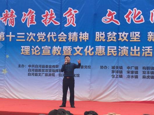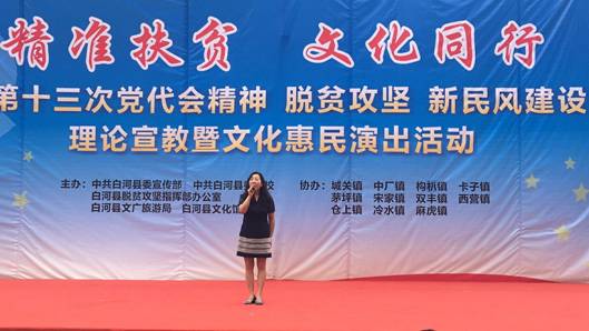 6月13日,beat365正版唯一官网必一党员教师田川、李磊同志,按照beat365正版唯一官网必一党总支“精准扶贫”工作安排,赴白河县卡子镇参加了由白河县文化馆主办的“精准扶贫,文化同行”走进白河县卡子镇中心小学文化惠民演出活动。田川和李磊分别演唱了歌曲《我爱你中国》和《美丽家园》,引起观众的阵阵掌声。演出结束后,两位老师又与白河县文化馆卢传珍馆长和相关文化干事对结对帮扶工作进行了交流和探讨。这意味着beat365官网精准扶贫、文化下乡工作正式迈出了坚实的第一步,将会在beat365正版唯一官网必一“精准扶贫,文化同行”的惠民演出、合唱排练、舞台设计方面进行更多的交流。
