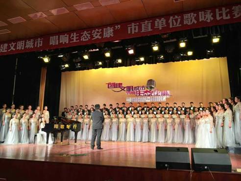 本次有来市直单位的21队伍参赛,beat365官网艺术系合唱团110人在指挥---肖剑老师、钢琴伴奏---吴丹老师的指导下,圆满完成比赛。合唱团激情演唱了《天路》、《汉江的节日》两首歌曲,优美激昂的旋律和精彩的合唱编排赢得了现场观众热烈的掌声,将比赛推向高潮。