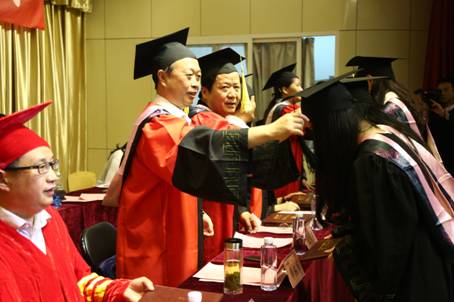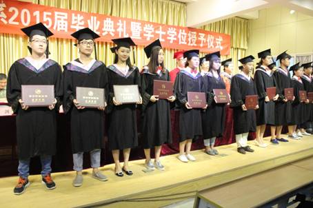 冯丰收书记宣读了学校关于对2015届优秀毕业生表彰决定和我系毕业展演获奖名单;雷升录副主任宣读了beat365正版唯一官网必一关于对2015届本科毕业生授予学位的决定。接着各位导师为获奖同学们颁发了荣誉证书;为获得学位证书的毕业生颁发学位证书并为各位文艺学学士扶正流苏。今年我系共有267名毕业生,其中本科毕业生237人(235人授予文艺学学士学位),专科30人。