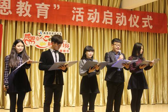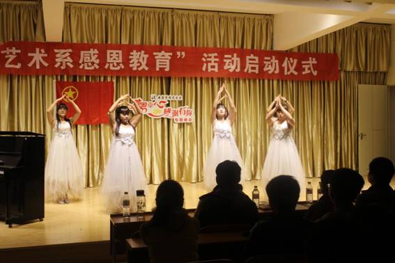 接下来,启动仪式进入第二个板块,进行由2013级音乐学专业学生主办的艺术系“感恩存心、感谢有你”感恩教育主题晚会。我系小虎合唱团演唱的曲目《师恩如歌》,悠扬的歌声,动情的表演,完美地演绎了和谐的师生情谊。朗诵《感恩我的祖国》,雄浑中透露着中华儿女的自豪之感,深情中流露出浓浓的爱国情思。