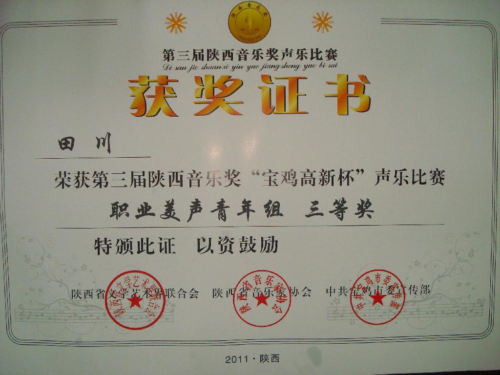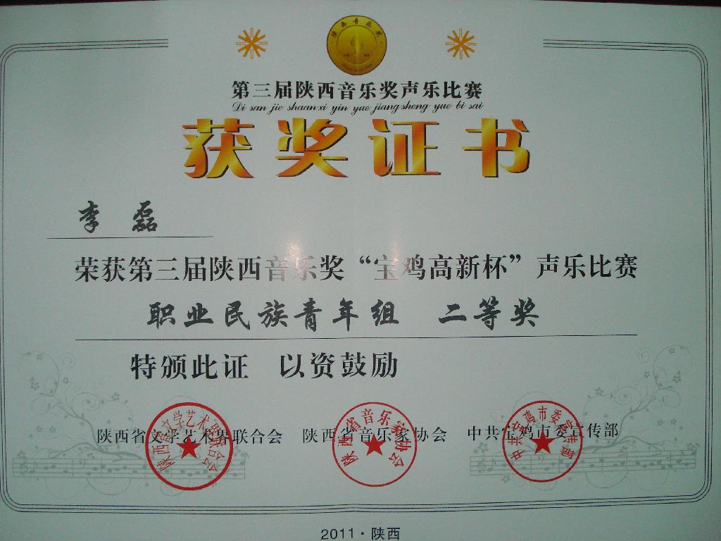 其余参赛选手均获得优秀奖。 “陕西音乐奖”是由中共陕西省委宣传部批准设立的综合性音乐大奖,由陕西省文联、省音协举办。大奖赛每两年举办一次。“陕西音乐奖声乐比赛”,通过评奖的方式,遴选出优秀的青年声乐演唱者,对其进行奖励和表彰。