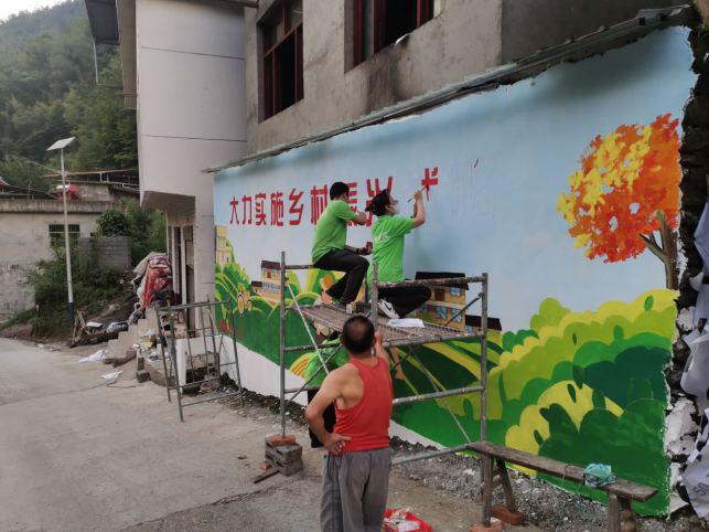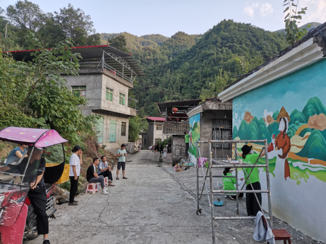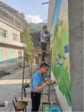 7月25—26日,院领导成党伟院长亲临现场指导,看到干劲十足的队员们,主动要求承担保障工作、接送队员、上色勾线。通过队员们的起早贪黑、顶着烈日的不懈努力,采茶图、丰收图和乡村振兴图终于大功告成,精美的画面、绚烂的色彩成为了村庄一道美丽的风景线,营造了文化氛围、提升了村庄风貌、激发了乡村活力,受到镇村领导和村民们的一致好评。