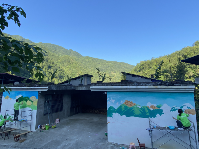 7月24日,团队成员迎着即将睡下的月光,开始了墙面绘画工作。伴随着清晨的鸟语花香与初升的太阳,一幅初步成形的采茶图、丰收图吸引了大量村民前来参观,还有村民搬来了凳子与队员们聊着家常,共同见证最后的成果。