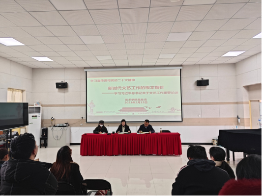会议伊始,党总支书记黄娟作了题为《新时代文艺工作的根本指针——学习习近平总书记关于文艺工作重要论述》学习宣传党的二十大精神专题党课。党课指出,习近平总书记所作的党的二十大报告,站在全面建设社会主义现代化国家、全面推进中华民族伟大复兴的战略高度,提出“推进文化自信自强,铸就社会主义文化新辉煌”的重大任务,为新时代新征程做好文艺工作指明了前进方向、提供了根本遵循。在本次专题学习中,黄娟重点讲解了习近平总书记关于文艺工作重要论述的两个核心思想。一是坚持与时代同步伐。习近平总书记强调,“新时代新征程是当代中国文艺的历史方位。广大文艺工作者要深刻把握民族复兴的时代主题,把人生追求、艺术生命同国家前途、民族命运、人民愿望紧密结合起来”。结合学院实际,黄娟要求新学期各教工党支部要充分发挥专业特色,有效开展学习宣传党的二十大精神特色教育活动。二是坚守艺术理想,追求德艺双馨。习近平总书记强调,“文艺承担着成风化人的职责。广大文艺工作者要发扬中国文艺追求向上向善的优良传统,心怀对艺术的敬畏之心和对专业的赤诚之心,下真功夫、练真本事、求真名声”。结合本学期的师德师风教育,黄娟要求党员教师要积极将“德艺双馨的人生之路、艺术之路” 作为毕生追求,为学院教师队伍建设发挥重要推动作用。