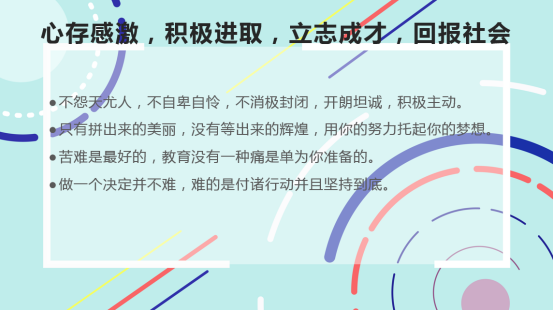本次班会围绕学生实际需求,以感恩、成才、励志为主题,意在培养学生对家庭、学校和社会的感恩意识和奉献意识,帮助同学们真正了解如何利用政策帮助自己更好的成长。主要从以下三点进行了解读: