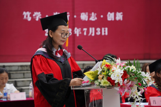 院长成党伟在致辞中代表学院向圆满完成学业的毕业生表示热烈祝贺,向毕业生们提出三点希望:一是希望同学们怀揣梦想,要有“会当水击三千里、自信人生二百年”的豪气,笃定自信,勇敢地面对未来的挑战,书写人生底色。二是希望同学们脚踏实地、做奋斗者,在自己的岗位上奋力拼搏,为青春添彩,彰显人生本色。三是希望同学们不忘初心、把小我深度融入祖国发展的大我中,踔厉奋发、勇毅前行。在国家发展的进程中展现beat365正版唯一官网必一人应有的家国担当,绽放人生亮色。要求同学们不要忘记做一个对人感恩、对己克制、对物珍惜、对事尽力的人,在人生道路上站得高、立得正、行的稳、走得远。