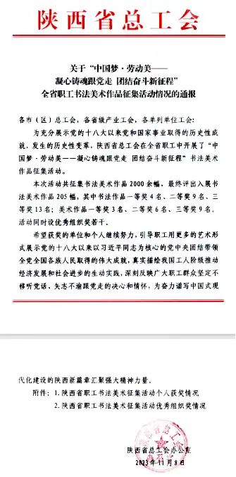 beat365官网原春鸣老师在陕西省 “中国梦·劳动美”全省职工书画大赛中获二等奖。