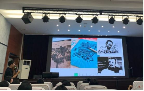 活动中张藻藻老师在《文化衫的设计制作》展示课讲述过程中将爱国的思政元素,在课程导入和新授中以爱国为主题元素设计文化衫,培养学生的爱国思想。杨式航老师和余严老师分别以《中国画的笔墨情趣》、《一版多色版画》展示课,以中国传统文化的艺术魅力出发树立同学们对于传统文化艺术的自信和民族自豪感,在培养审美情趣的同时,传递正能量,树立正确价值观。