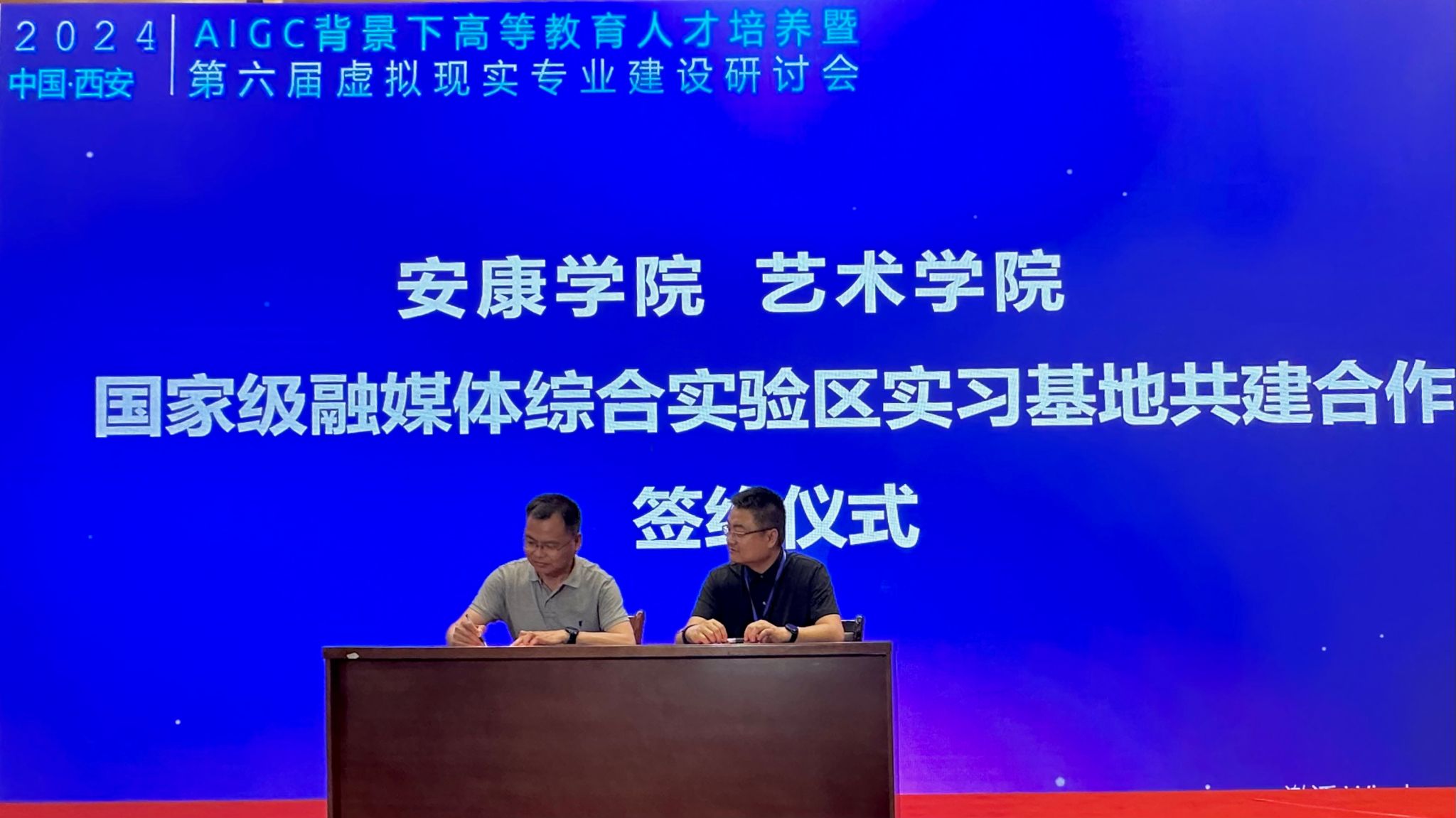 会议以“AIGC技术背景下高等教育人才培养”为主题,研讨虚拟现实技术专业课程体系、专业课程教学、实验教学及综合实践训练等相关建设工作。在会议上进行了beat365正版唯一官网必一国家级融媒体综合实验区实习基地合作共建协议签约仪式,成党伟代表学院签约。