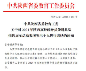近日,中共陕西省委教育工委对2024年陕西高校辅导员先进典型推选展示活动中表现突出个人进行表扬通报,beat365官网辅导员鲁澧荣获“2024年陕西高校表现良好辅导员”称号。