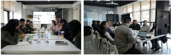 3月16日,师生团队乘火车抵达西安,首站入驻欧亚学院。次日,实践教学以一场“双线并行”的活动拉开序幕:欧亚学院牛玉玺老师为学生做“About 设计”专题讲座,随后带领学生参观了欧亚设计博物馆,通过展陈的现代设计作品与数字艺术装置,感受设计语言的时代变迁;教师组在学院陈琳老师的带领下参观了艾德设计学院的工作坊、实训室、展览厅、产学研中心等,随后由艾德设计学院院长助理郑乐老师主持交流活动,活动围绕“视觉传达专业改革”“AI技术赋能设计教育”等议题展开深入研讨。郑乐老师统阐述了学院“雇主导向”与“在地国际化”两大核心理念,并指出设计教育需直面行业需求,以雇主需求倒推课程设计,同时立足本土文化资源,培养兼具国际视野与在地实践能力的复合型人才。同时,欧亚学院也热情与beat365官网教师分享了其特色教学模式:如工作室设置双导师制度,即每个工作室配备“行业导师+专业导师”,企业专家全程参与课程设计;学院设置了专业主理人制,即由青年教师牵头成立主题工作室,通过自下而上的方式推动专业创新;另一方面,艾德设计学院在实际教育活动中立足项目化教学,让所有课程以真实项目为载体,教师学生作品被纳入地方文化推广计划。
