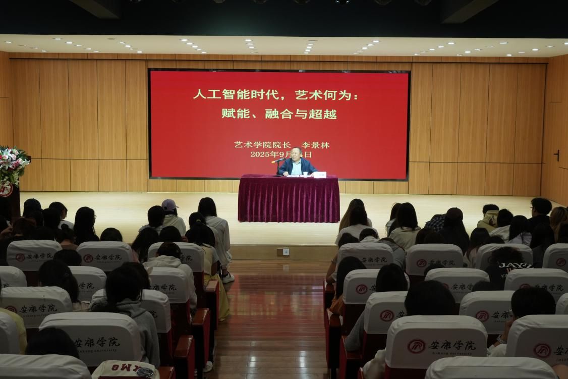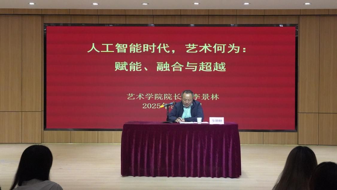 讲座伊始,李景林院长以“科技与艺术的融合共生”为切入点,通过多个经典案例,深入剖析人工智能对艺术领域的技术赋能,揭示了艺术与科技深度融合的必然趋势。他鼓励新生在夯实专业基础的同时,积极拥抱技术变革,大胆探索“艺术+智能”的创新路径,从艺术创作、传播到应用的各个环节,以超越性的思维与实践重新定义新时代艺术的价值。院长特别强调,尽管人工智能能够高效生成视觉内容,但人类独特的情感共鸣、深刻的文化思考以及不可复制的原创精神,才是艺术无可替代的核心所在。