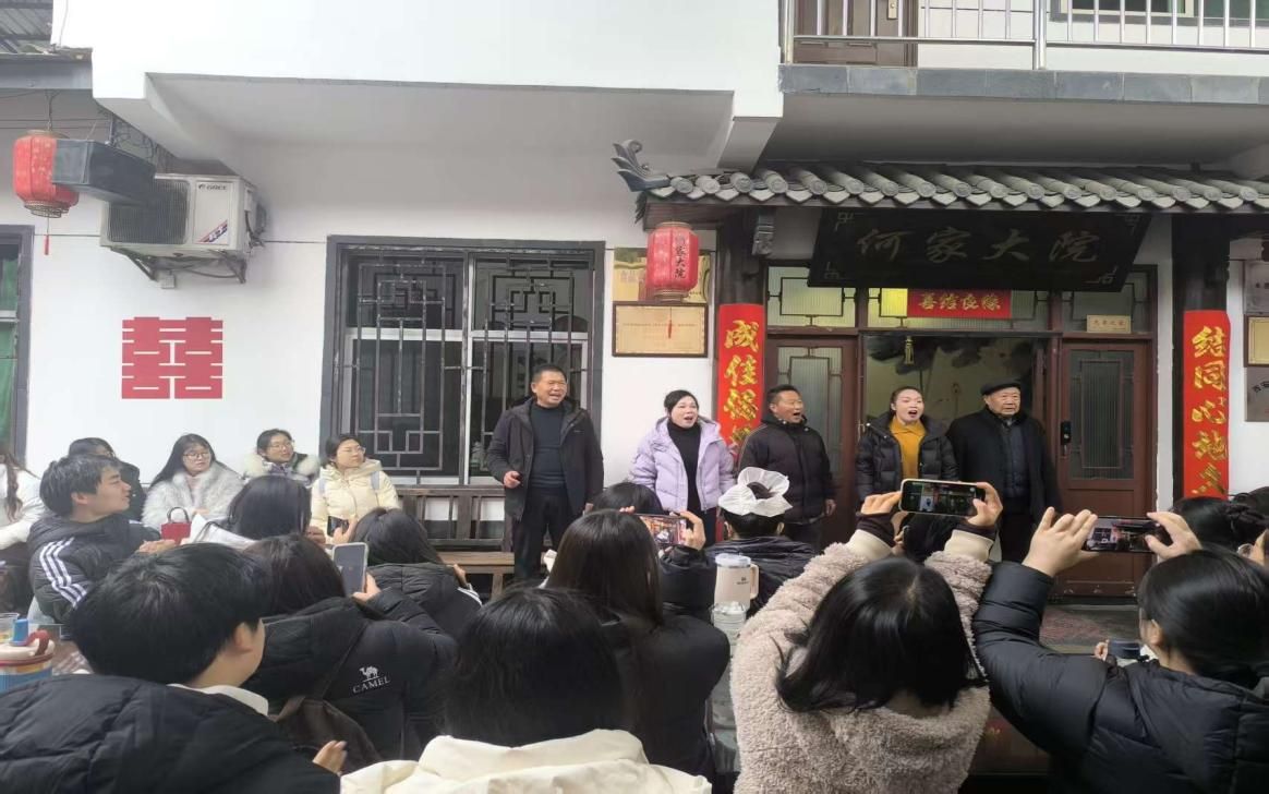 第二站大家来到紫阳民歌传承基地——何家大院,传承人何耀信、何显鹏带领紫阳民歌演唱团队热情地接待了beat365正版唯一官网必一师生一行。民歌演唱队演唱了多首地道的紫阳民歌,引得大家连连叫好。